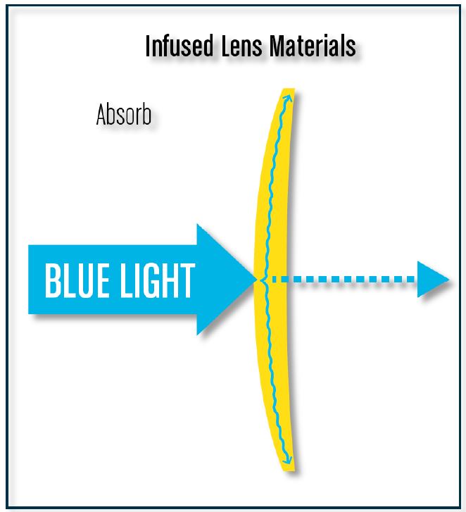 Infused/En Masse Lenses: Defense at the Core Another blue light defense option involves the use of substrate attenuation materials infused directly into the lens to absorb blue light. Infused—or en masse—lens materials have pigments added to the lens monomer (a type of molecule used in forming polymers) to absorb blue light. Some of these lenses feature a yellow or orange appearance, which may be undesirable for some wearers. Infused lenses generally provide their maximum defense around the 450-475 nm range.